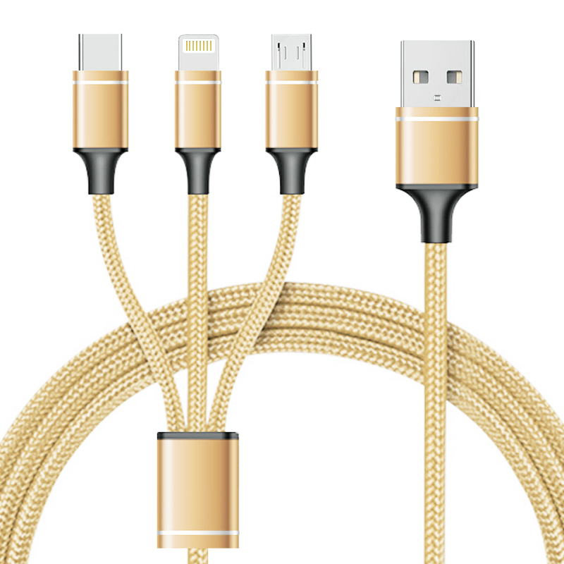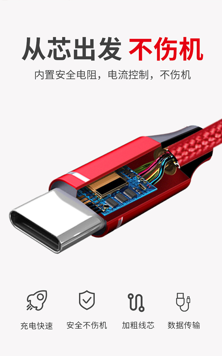 一拖三快充线,安卓/Type-C/苹果;2.4A安全快充;尼龙编织,更耐用;接头加固,防开裂;充电快,不弹窗。